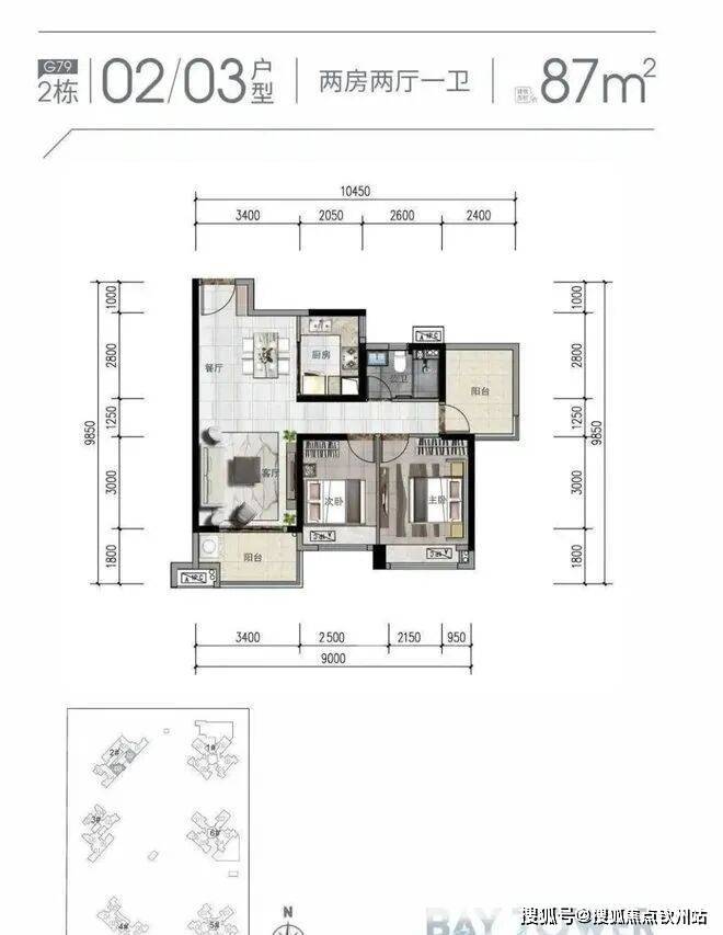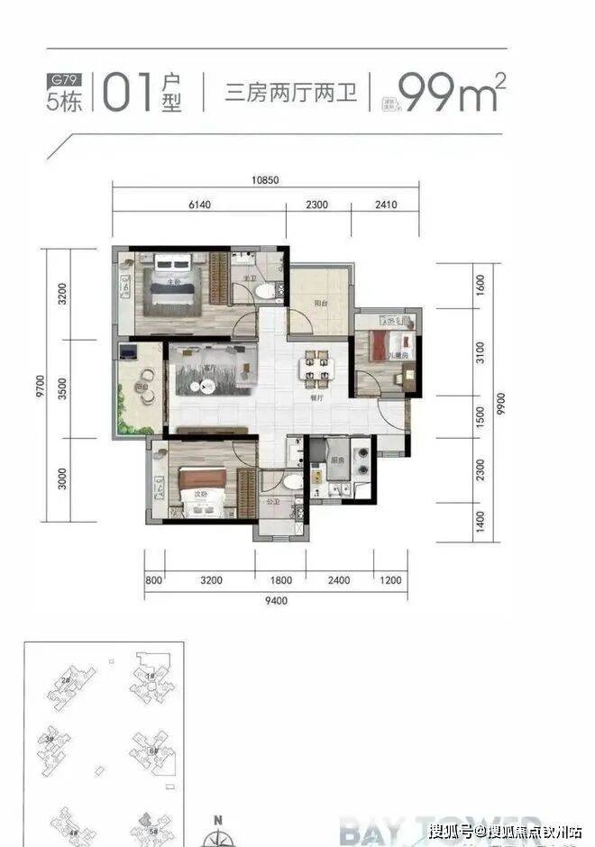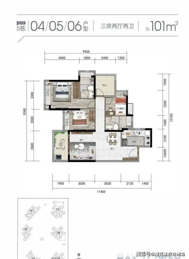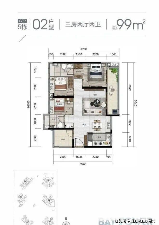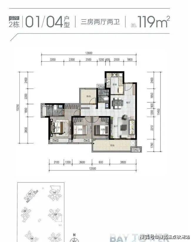 (1)119㎡三室两厅一卫(G83户型):户型方正,动静分离,采光充足。