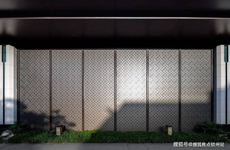 当然,中国传统大门是木制的,屋顶以瓦覆盖,耐用性较差。华发院子门楼屋顶采用铝镁合金板材,通过现代工艺呈现传统建筑韵味。大门展开,细腻窗花和格栅组成的重重屏风,暖光斑驳,更像是一面玫瑰金的不锈钢影壁,与前方两侧香槟金不锈钢格栅围合成一个入户大堂,在保留了门的威严之余,更为符合现代化审美以及实用性。