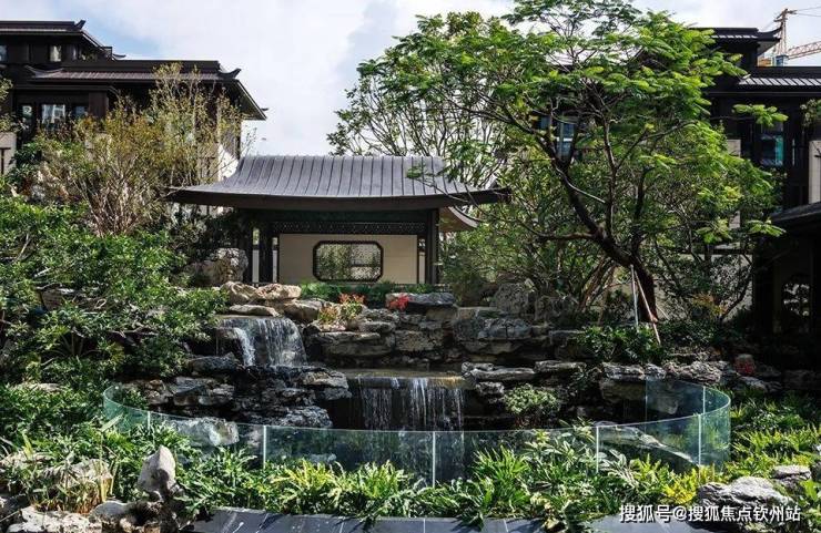 从大门进入中轴,中心园区打造了叠水汪潭,叠水流瀑的另一侧,是由神似太湖石的英德石堆叠而成的假山,假山又巧妙构建为一道门洞