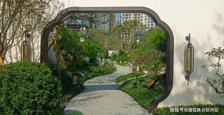 在中轴景观上,每穿过一个类似苏州园林月亮门的拱门,都会呈现一些不同的景致。例如以罗汉松为主题的“松里”,以小桥流水、睡莲游鱼为主要景观装饰的“泛菱”等。