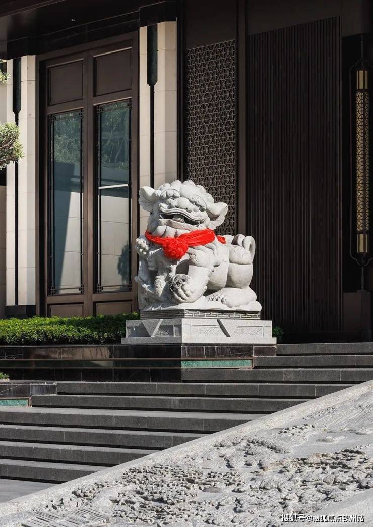 门前一座12级步阶、高约1.6米的花岗岩阶陛,当中一块刻着珠海八景的地雕,神似有3层汉白玉台阶的太和殿。大门左右配以精致宫灯、名贵迎客松、南狮石像,不同于北狮的凶猛威严,多了几分岭南的休闲风情。这既是一个缓冲区域,连接大门与广场;也是一个稳如磐石、奇高无比的台基,寓意深厚。