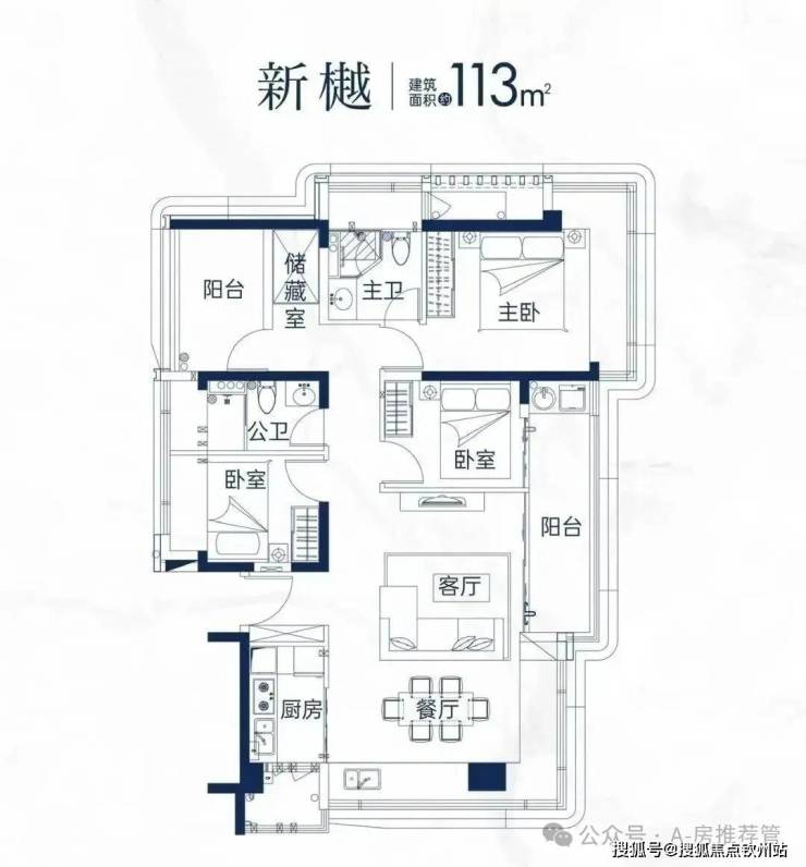 113㎡的4房2厅2卫,设计的是横厅南北通透格局,进门入户玄关,客餐厅一体化设计,餐厅位双飘窗无敌视野,全屋6个飘窗面,客厅连接次卧出5.6米长的巨幕大阳台,L型厨房带1个设备平台,卫生间干湿分离也带1个设备平台,得房率约94%(包含赠送),正东朝向。