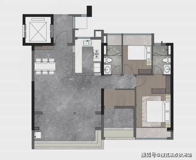 :约44㎡LDKG大方厅,U型厨房+岛式西厨,主卧配豪华衣帽间和270°转角飘窗。